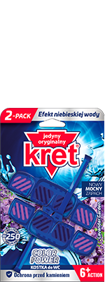 Kostka do WC Kret Color Power, dzięki formule 6+ action kompleksowo dba o Twoją toaletę.